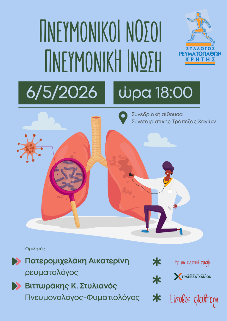 Σας ενημερώνουμε πως προτιθέμεθα να διοργανώσουμε ενημερωτική εκδήλωση στη συνεδριακή αίθουσα της Συνεταιριστικής Τράπεζας Χανίων την Τετάρτη 6/5/2026 και ώρα 18:00, με τίτλο «Πνευμονικοί νόσοι – Πνευμονική Ίνωση», και ομιλητές την κα Αικατερίνη Πατερομιχελάκη, ρευματολόγο και τον κο Στυλιανό Βιττωράκη,Πνευμονολόγο-Φυματιολόγο.