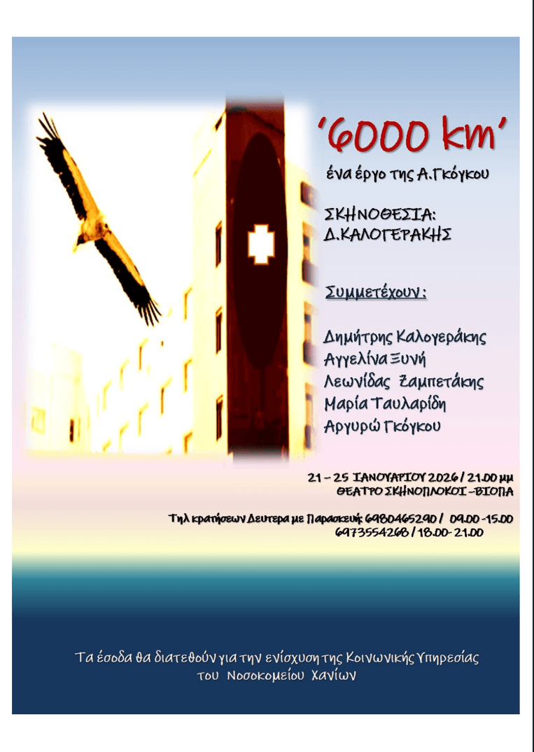 Με χαρά θα θέλαμε να σας προσκαλέσουμε στη θεατρική παράσταση ‘6000 χιλιόμετρα’ , η οποία θα πραγματοποιηθεί από 21 έως και 25/1/2026 στις 21.00μμ στο θέατρο ΣΚΗΝΟΠΛΟΚΟΙ στο ΒΙΟΠΑ Χανίων.